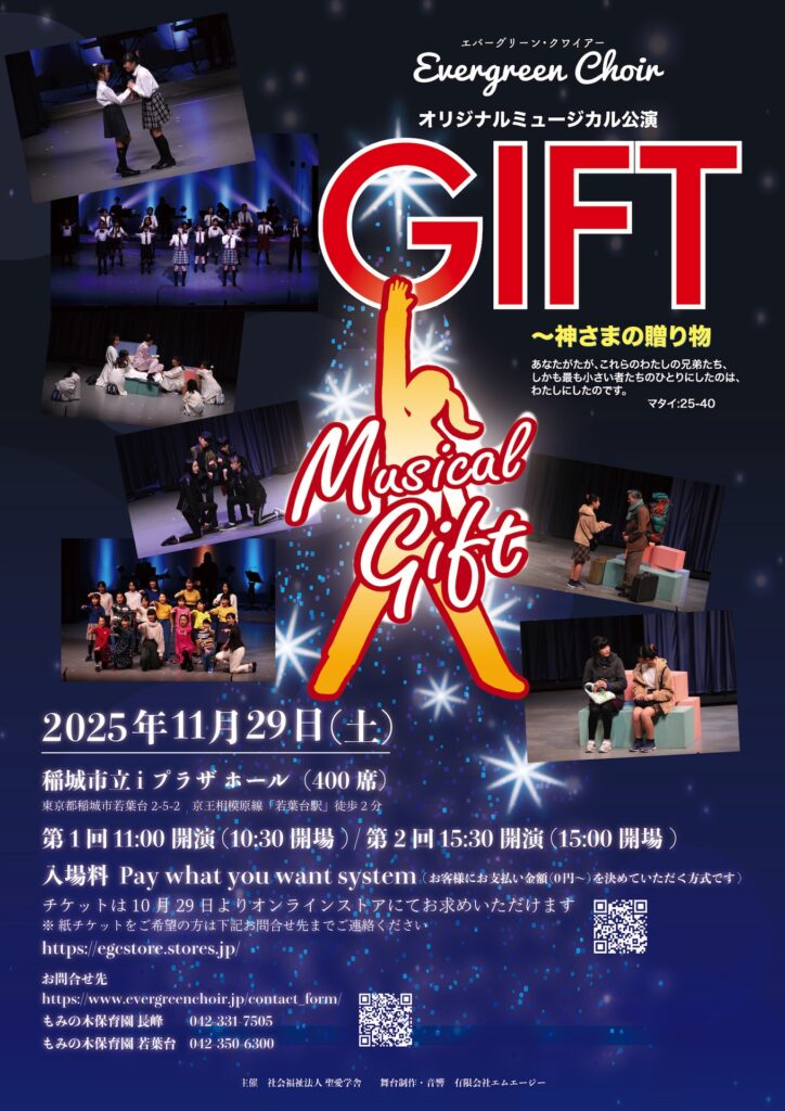 2025年11月29日(土)エバーグリーンクワイアー オリジナルミュージカル「GIFT 〜神さまの贈り物」が、東京都稲城市にある iプラザ ホールにて上演されます。